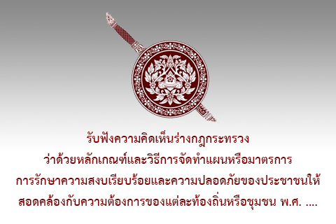 19 สิงหาคม 2568 รับฟังความคิดเห็นร่างกฎกระทรวงว่าด้วยหลักเกณฑ์และวิธีการจัดทำแผนหรือมาตรการการรักษาความสงบเรียบร้อยและความปลอดภัยของประชาชนให้สอดคล้องกับความต้องการของแต่ละท้องถิ่นหรือชุมชน พ.ศ. ...