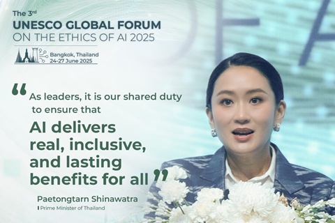 25 มิถุนายน 2568 ไทยยืนหนึ่งเวทีโลก! นายกฯ “แพทองธาร” ประกาศวิสัยทัศน์ ขับเคลื่อน AI อย่างมีจริยธรรม เพื่อทุกคน พร้อมเปิดฉากอย่างยิ่งใหญ่ The 3rd UNESCO Global Forum on the Ethics of AI 2025...